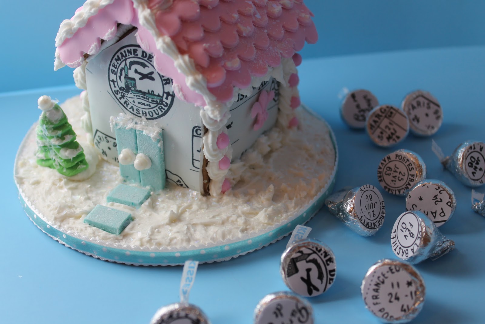 printables from the internet are all good options. I used a french postmark from Cathe Holden's website justsomethingimade.com for this project. I cut apart the images, spread them apart and reprinted to make it work for the gingerbread house. Then I took it to my local cake shop